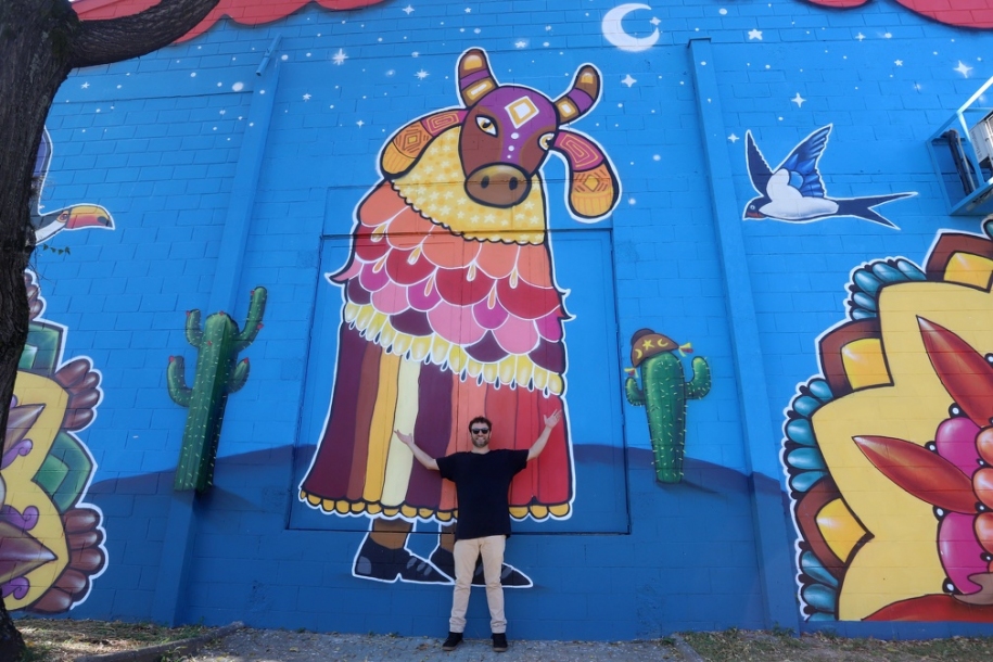 Um dos murais, intitulado “Lá no Céu” e criado por José Flávio Audi, apresenta elementos da cultura popular brasileira. A obra de 105m² retrata um boi-bumbá, figuras de baianas, cactos e animais como a andorinha, símbolo de Campinas, e o tucano, representando a natureza presente na cidade. “O meu mural representa a cultura brasileira, a cultura do boi-bumbá, das baianas, os cactos, faz menção ao nordeste que a gente tem aqui dentro do estado de São Paulo, que é gigante”, explica o artista.