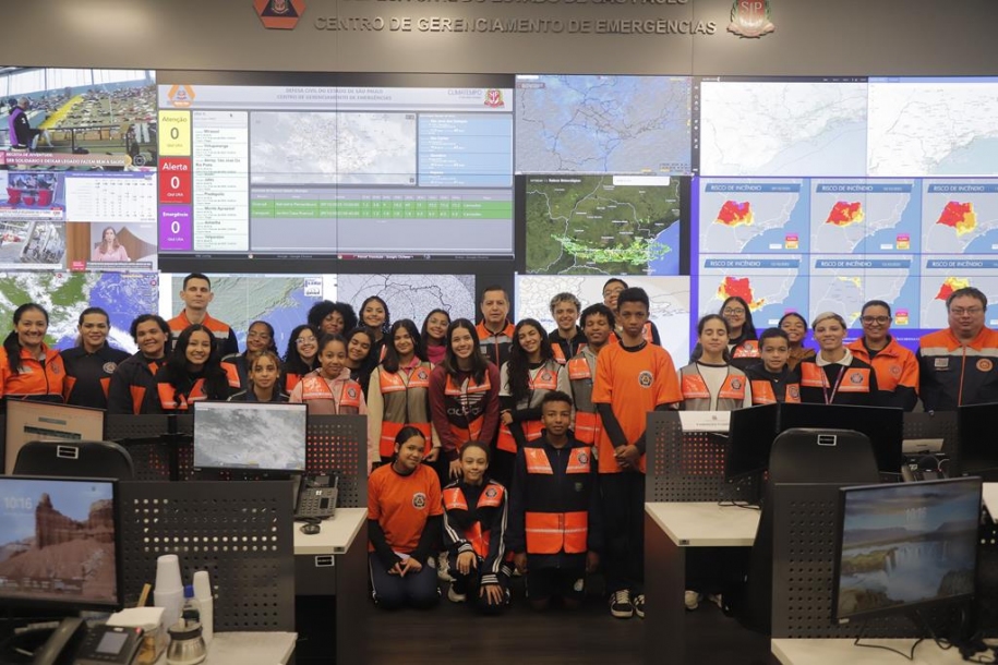 Como parte do curso de formação de Agentes Multiplicadores de Proteção e Defesa Civil, organizado anualmente pela Defesa Civil de Barueri, 23 alunos da EMEF Armando Cavazza, localizada no Engenho Novo, visitaram o Palácio dos Bandeirantes na manhã da última quinta-feira, dia 9. Três monitores do Palácio — Raquel Ruiz, Tiel Dell Valhe e Luísa Saavedra — acompanharam os agentes multiplicadores na visita ao Centro Paulista de Radares e Alertas Meteorológicos e ao CGE (Centro de Gerenciamento de Emergências), órgãos da Defesa Civil do Estado de São Paulo responsáveis pela prevenção e atendimento a emergências em todos os municípios paulistas.