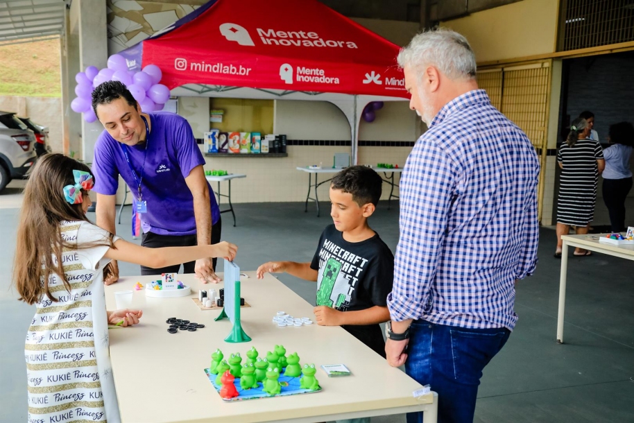 Na Escola Municipal Holmes Villar, a equipe da Mind Lab esteve presente, proporcionando momentos de interação e aprendizado por meio de jogos e atividades que estimulam o raciocÃnio lógico, a cooperação e o pensamento estratégico. As crianças participaram ativamente das dinâmicas, vivenciando na prática a proposta inovadora do programa.