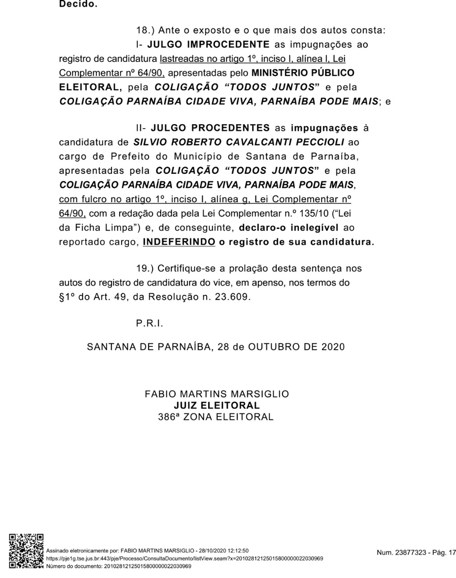 O Juiz Fábio Martins Marsiglio, da Vara da Comarca de Santana de ParnaÃba, indeferiu a candidatura a prefeito de Silvio Peccioli (PSD) nas eleições 2020.