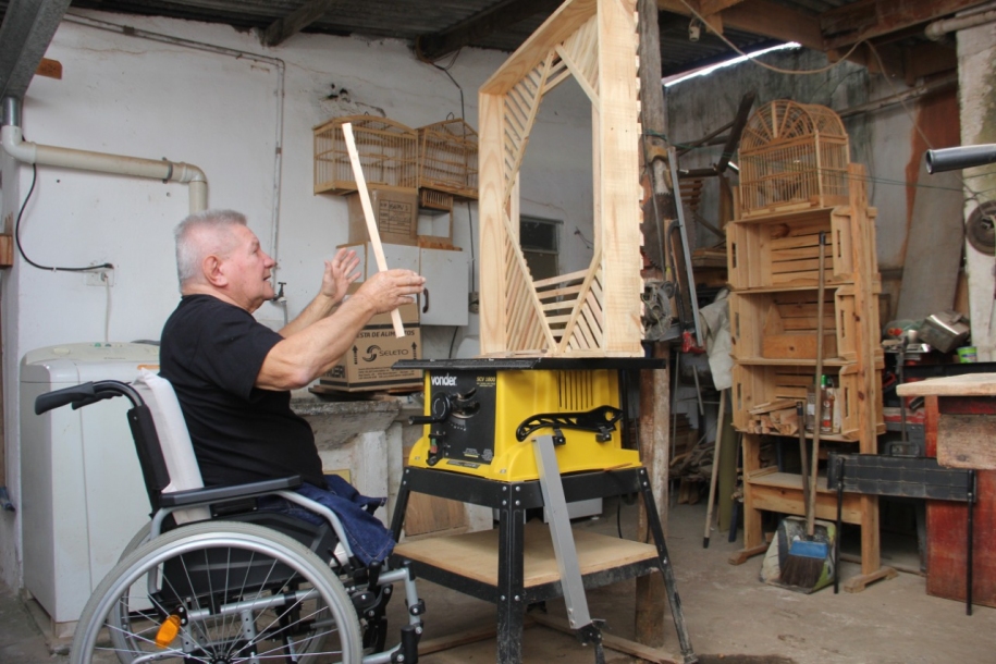 João mora sozinho e divide o tempo dele em ouvir música na sua vitrola – coleciona vinis raros – com sua oficina de marcenaria, local onde confecciona prateleiras, mesas, gaiolas e até porta-celular de madeira. “Meu pai era carpinteiro, desde muito pequeno eu ajudava ele. Isso sempre me deu muito prazer, é o hobby que eu tenho”, conta o aposentado que lida com as dificuldades do dia a dia impostos pela deficiência após amputar as duas pernas por causa de uma complicação causada pelo diabetes.