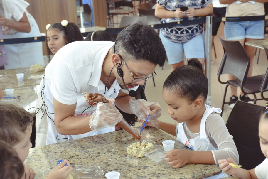 A oficina foi realizada na praça de alimentação do Anhanguera Parque Shopping e contou com a participação de crianças de 4 a 12 anos. As crianças se divertiram e se lambuzaram produzindo bolos de pote com recheio de chocolate, e cada pequeno confeiteiro deixou sua marca especial em suas criações.