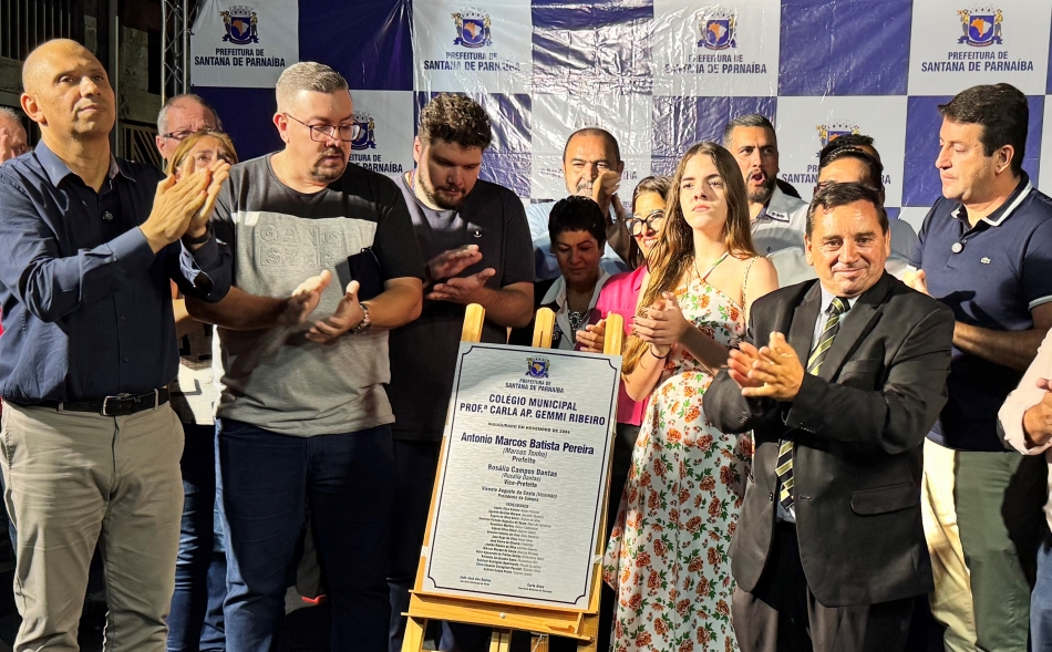 Santana de Parnaíba celebrou mais um importante avanço em sua rede de ensino. O prefeito Marcos Tonho, ao lado do prefeito eleito Elvis Cezar, nesta terça-feira (26), realizou a inauguração do novo e moderno Colégio Municipal Professora Carla Aparecida Gemmi Ribeiro, localizado na Rua Ernesto de Fiori, no bairro Colinas da Anhanguera. O evento ainda contou com a presença do vice-prefeito eleito, Vicentão, secretários municipais, vereadores, lideranças comunitárias, centenas de moradores e familiares da homenageada.