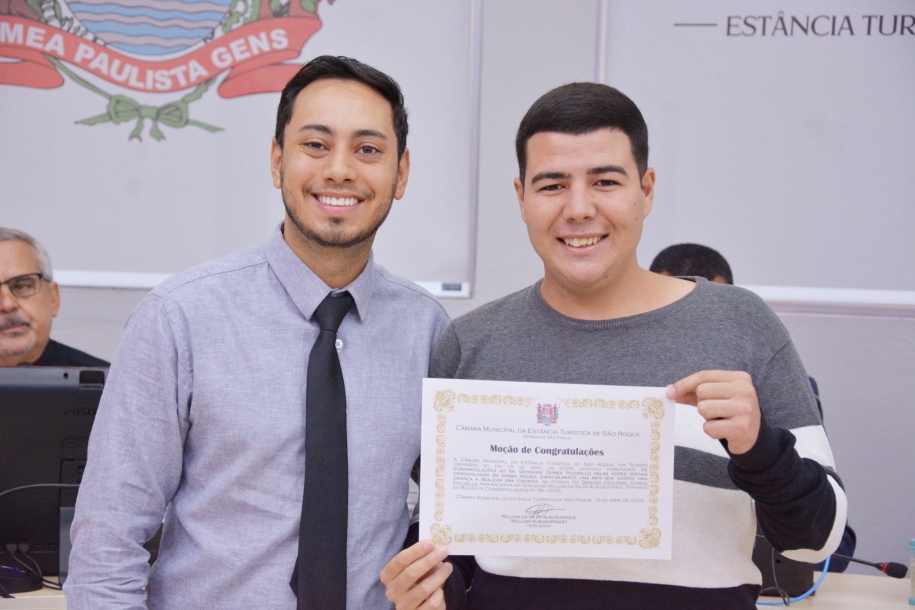 O morador de São Roque, Giovanne Gomes Piccirillo, foi homenageado na Câmara Municipal, no dia 15 de abril, com uma Moção de Congratulações, concedida pelo vereador William Albuquerque, em reconhecimento à s relevantes ações sociais promovidas em prol da comunidade. Atuante, respeitado e amplamente conhecido por seu engajamento social, Giovanne tem se dedicado a transformar, com sensibilidade e compromisso, a realidade do bairro onde vive e de muitas famÃlias da cidade.